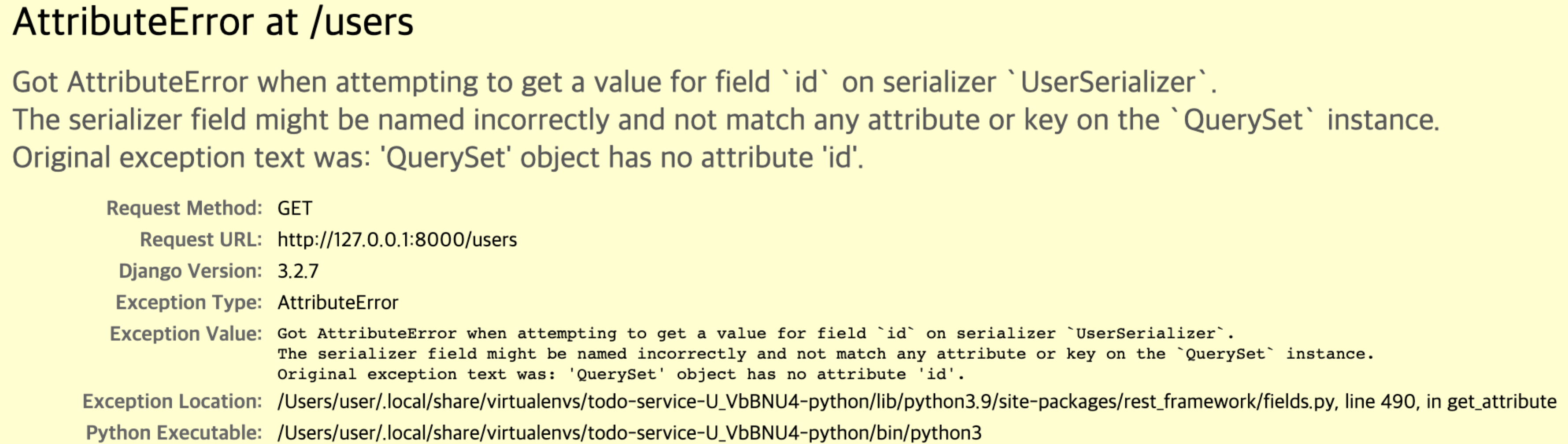 Got AttributeError when attempting to get a value for field `id` on serializer `UserSerializer`.